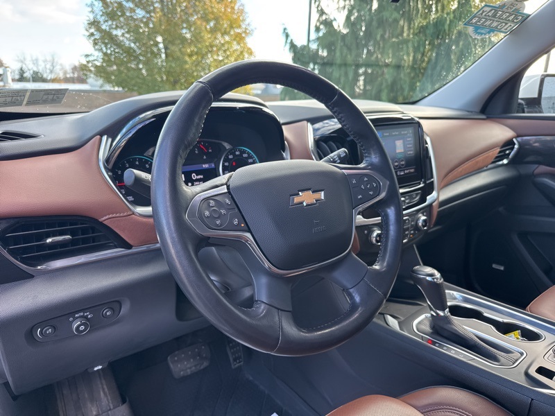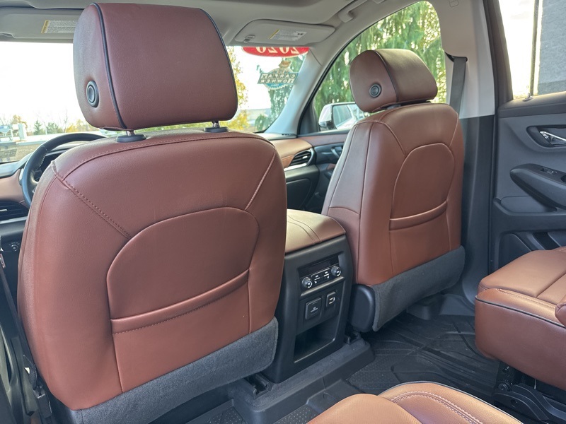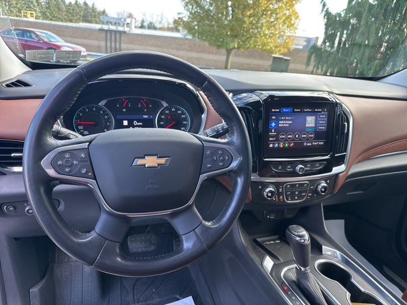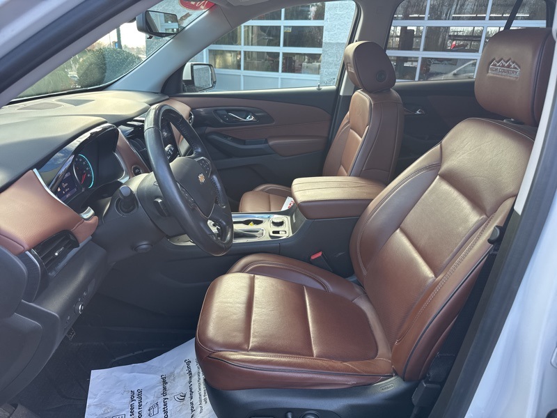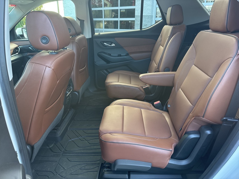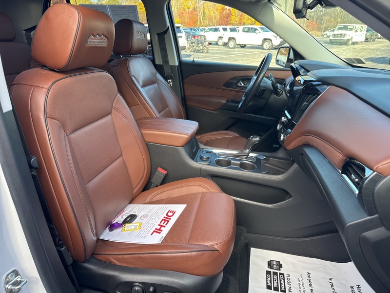 Iridescent Pearl Tricoat 2020 Chevrolet Traverse High Country 4D Sport Utility AWD 3.6L V6 SIDI VVT 9-Speed Automatic Floor Liner Package (LPO) (1st & 2nd Row All-Weather Floor Liner (LPO), 3rd Row All-Weather Floor Liner (LPO), and Integrated Cargo Liner (LPO)), Preferred Equipment Group 2LZ, Traverse High Country, AWD, Jet Black/Loft Brown Leather, 10 Speakers, 20" Polished Aluminum Wheels, 3.49 Axle Ratio, 3rd row seats: split-bench, 4-Wheel Disc Brakes, 7-Passenger Seating (2-2-3 Seating Configuration), ABS brakes, Air Conditioning, Alloy wheels, AM/FM radio: SiriusXM, Apple CarPlay/Android Auto, Auto High-beam Headlights, Auto-dimming door mirrors, Auto-dimming Rear-View mirror, Automatic temperature control, Bose Premium 10-Speaker Audio System Feature, Brake assist, Bumpers: body-color, Compass, Delay-off headlights, Driver door bin, Driver vanity mirror, Dual front impact airbags, Dual front side impact airbags, Electronic Stability Control, Emergency communication system: OnStar and Chevrolet connected services capable, Four wheel independent suspension, Front anti-roll bar, Front Bucket Seats, Front Center Armrest, Front dual zone A/C, Front fog lights, Front reading lights, Fully automatic headlights, Garage door transmitter, Heated door mirrors, Heated front seats, Heated rear seats, Heated steering wheel, Illuminated entry, Leather steering wheel, Low tire pressure warning, Memory seat, Navigation System, Occupant sensing airbag, Outside temperature display, Overhead airbag, Overhead console, Panic alarm, Passenger door bin, Passenger vanity mirror, Perforated Leather-Appointed Seat Trim, Power door mirrors, Power driver seat, Power Liftgate, Power moonroof: Dual SkyScape, Power passenger seat, Power steering, Power windows, Premium audio system: Chevrolet MyLink, Radio data system, Radio: Chevrolet Infotainment 3 Premium System, Rear air conditioning, Rear anti-roll bar, Rear reading lights, Rear window defroster, Rear window wiper, Remote keyless entry, Roof rack: rails only, Security system, SiriusXM w/360L, Speed control, Speed-sensing steering, Spoiler, Steering wheel memory, Steering wheel mounted audio controls, Tachometer, Telescoping steering wheel, Tilt steering wheel, Traction control, Trip computer, Turn signal indicator mirrors, Variably intermittent wipers, Ventilated front seats, and Voltmeter. Odometer is 51633 miles below market average!