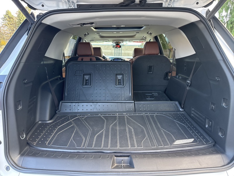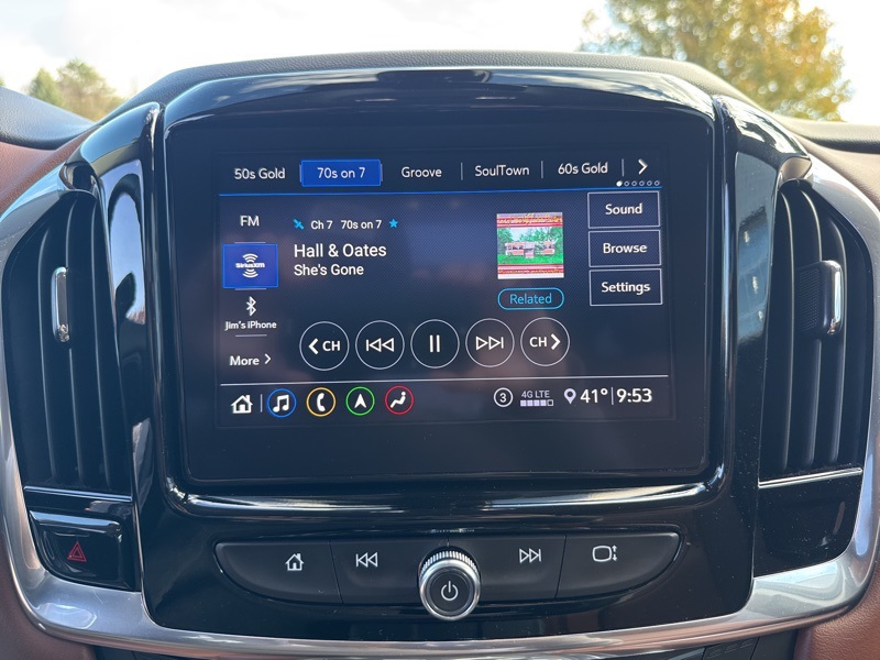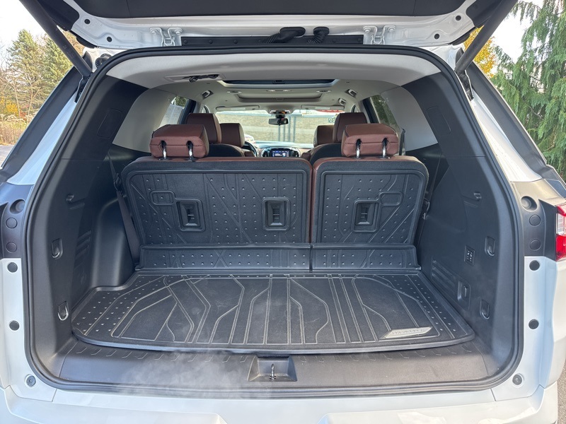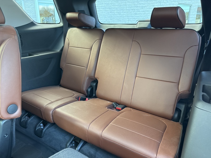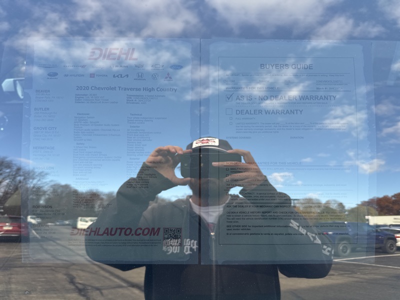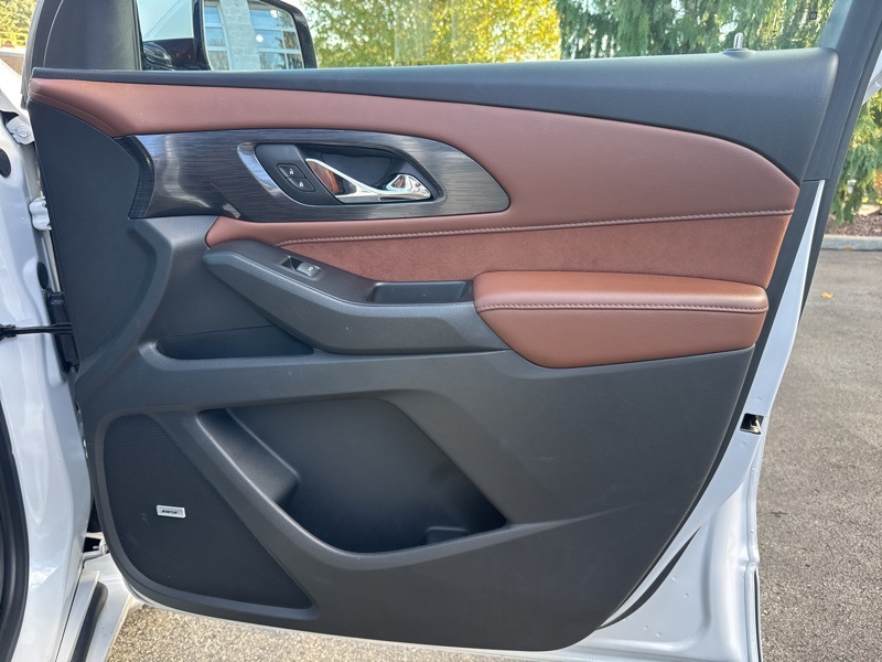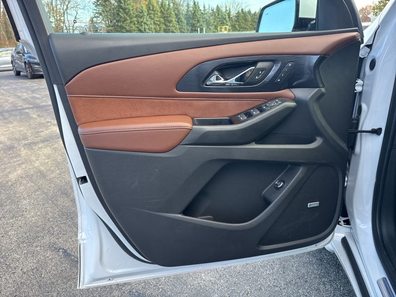 Iridescent Pearl Tricoat 2020 Chevrolet Traverse High Country 4D Sport Utility AWD 3.6L V6 SIDI VVT 9-Speed Automatic Floor Liner Package (LPO) (1st & 2nd Row All-Weather Floor Liner (LPO), 3rd Row All-Weather Floor Liner (LPO), and Integrated Cargo Liner (LPO)), Preferred Equipment Group 2LZ, Traverse High Country, AWD, Jet Black/Loft Brown Leather, 10 Speakers, 20" Polished Aluminum Wheels, 3.49 Axle Ratio, 3rd row seats: split-bench, 4-Wheel Disc Brakes, 7-Passenger Seating (2-2-3 Seating Configuration), ABS brakes, Air Conditioning, Alloy wheels, AM/FM radio: SiriusXM, Apple CarPlay/Android Auto, Auto High-beam Headlights, Auto-dimming door mirrors, Auto-dimming Rear-View mirror, Automatic temperature control, Bose Premium 10-Speaker Audio System Feature, Brake assist, Bumpers: body-color, Compass, Delay-off headlights, Driver door bin, Driver vanity mirror, Dual front impact airbags, Dual front side impact airbags, Electronic Stability Control, Emergency communication system: OnStar and Chevrolet connected services capable, Four wheel independent suspension, Front anti-roll bar, Front Bucket Seats, Front Center Armrest, Front dual zone A/C, Front fog lights, Front reading lights, Fully automatic headlights, Garage door transmitter, Heated door mirrors, Heated front seats, Heated rear seats, Heated steering wheel, Illuminated entry, Leather steering wheel, Low tire pressure warning, Memory seat, Navigation System, Occupant sensing airbag, Outside temperature display, Overhead airbag, Overhead console, Panic alarm, Passenger door bin, Passenger vanity mirror, Perforated Leather-Appointed Seat Trim, Power door mirrors, Power driver seat, Power Liftgate, Power moonroof: Dual SkyScape, Power passenger seat, Power steering, Power windows, Premium audio system: Chevrolet MyLink, Radio data system, Radio: Chevrolet Infotainment 3 Premium System, Rear air conditioning, Rear anti-roll bar, Rear reading lights, Rear window defroster, Rear window wiper, Remote keyless entry, Roof rack: rails only, Security system, SiriusXM w/360L, Speed control, Speed-sensing steering, Spoiler, Steering wheel memory, Steering wheel mounted audio controls, Tachometer, Telescoping steering wheel, Tilt steering wheel, Traction control, Trip computer, Turn signal indicator mirrors, Variably intermittent wipers, Ventilated front seats, and Voltmeter. Odometer is 51633 miles below market average!