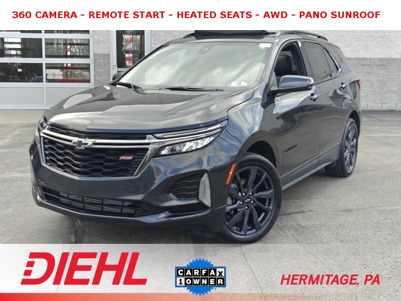 Recent Arrival! **ONE OWNER**, **CLEAN CARFAX**, **3MONTH-3,000 MILE WARRANTY INCLUDED**, **ALL WHEEL DRIVE**, **HEATED SEATS**, **ADAPTIVE CRUISE CONTRL**, **LANE KEEP ASSIST**, **BLIND SPOT DETECTION**, **FRONT CRASH DETECTION**, **BLUETOOTH**, **BACKUP CAMERA**, **ALLOY WHEELS**, ** REMOTE START**, **PANO SUNROOF**, **360 SURROUND CAMERA**, **POWER LIFTGATE**, **ANDROID AUTO**, **APPLE CARPLAY*, Equinox RS, AWD, Iron Gray Metallic, Jet Black Leather, 120-Volt Power Outlet, 19" Aluminum Wheels, 2 USB Data Ports, 2 USB Data Ports w/SD Card Reader, 8-Way Power Driver Seat Adjuster, Adaptive Cruise Control, Advanced Safety Package, Auto High-beam Headlights, Automatic temperature control, Bluetooth® For Phone, Bose Premium 7-Speaker Audio System Feature, Delay-off headlights, Driver Seatback Map Pocket, Front dual zone A/C, Fully automatic headlights, HD Surround Vision, Heated Driver & Front Passenger Seats, Heated Steering Wheel, Infotainment Package, Low tire pressure warning, Outside Heated Power Adjustable Mirrors, Perforated Leather-Appointed Seat Trim, Power driver seat, Power Liftgate, Power Sunroof, Preferred Equipment Group 1RS, Radio: Chevrolet Infotainment 3 Plus System w/Navi, Remote keyless entry, RS Leather Package, Steering wheel mounted audio controls, Tilt steering wheel.