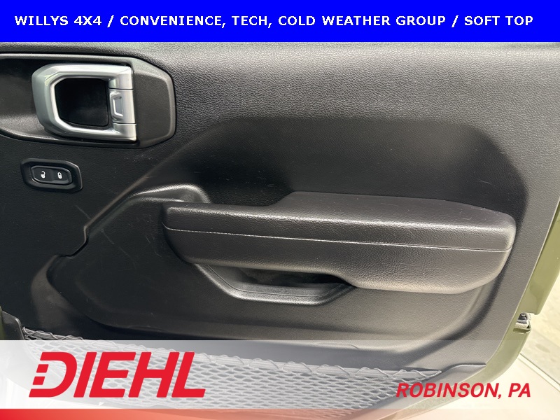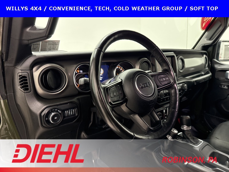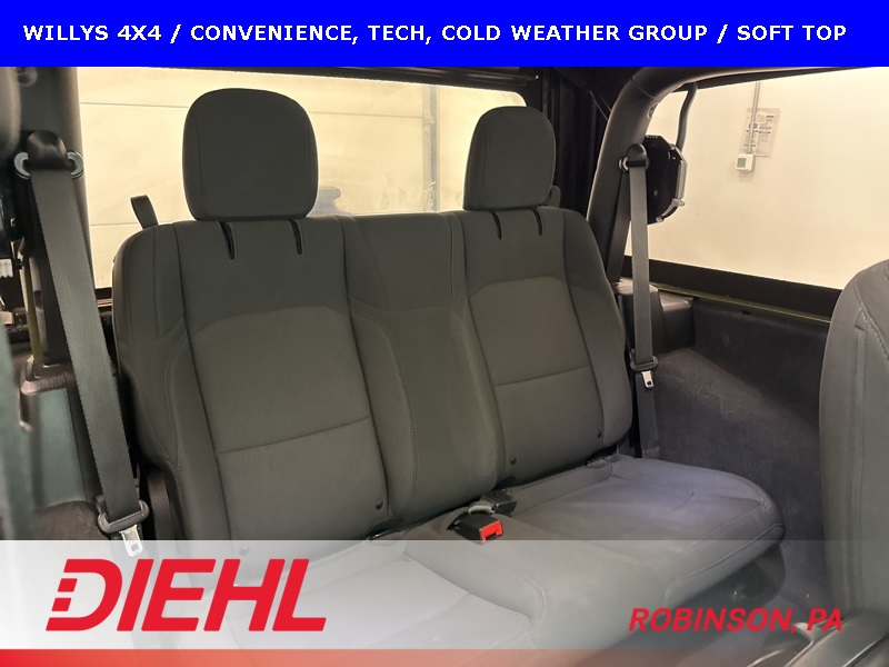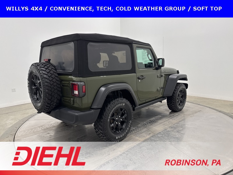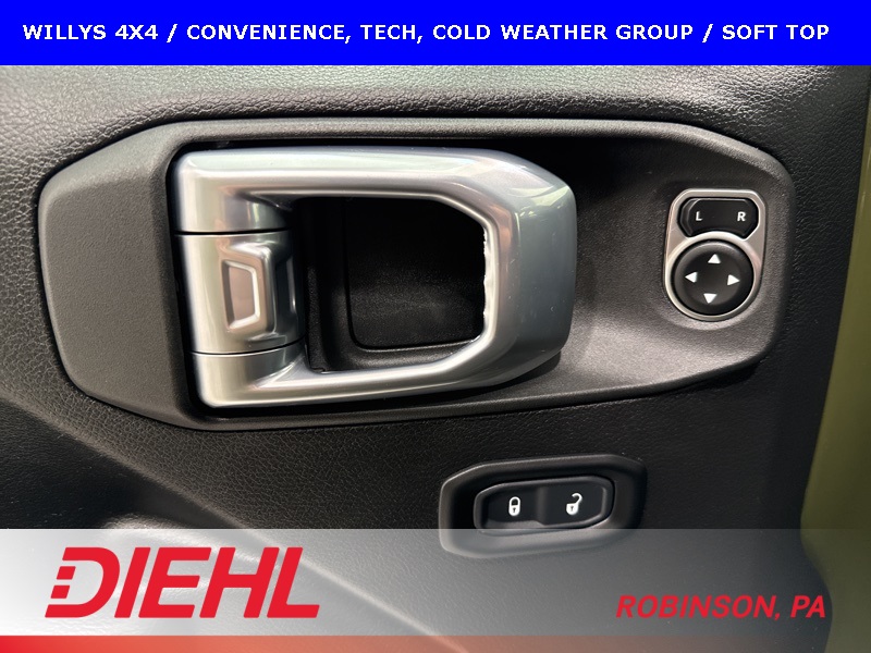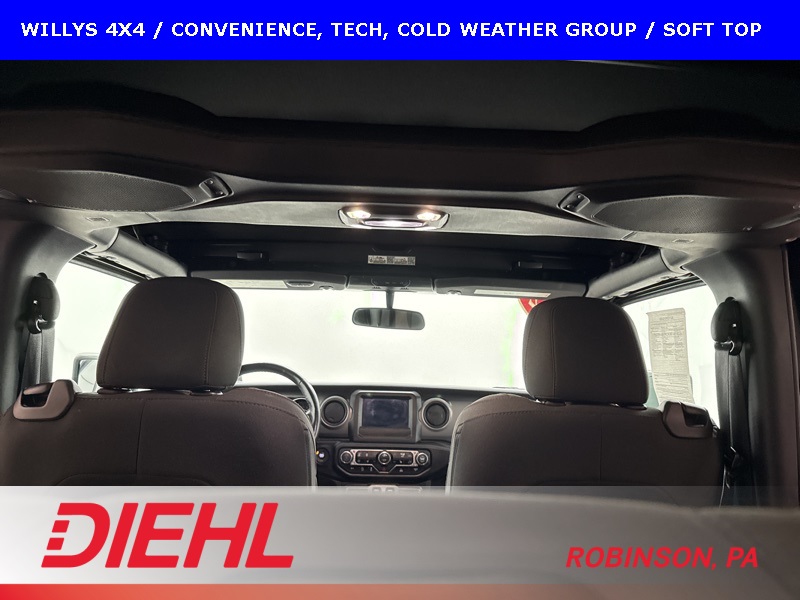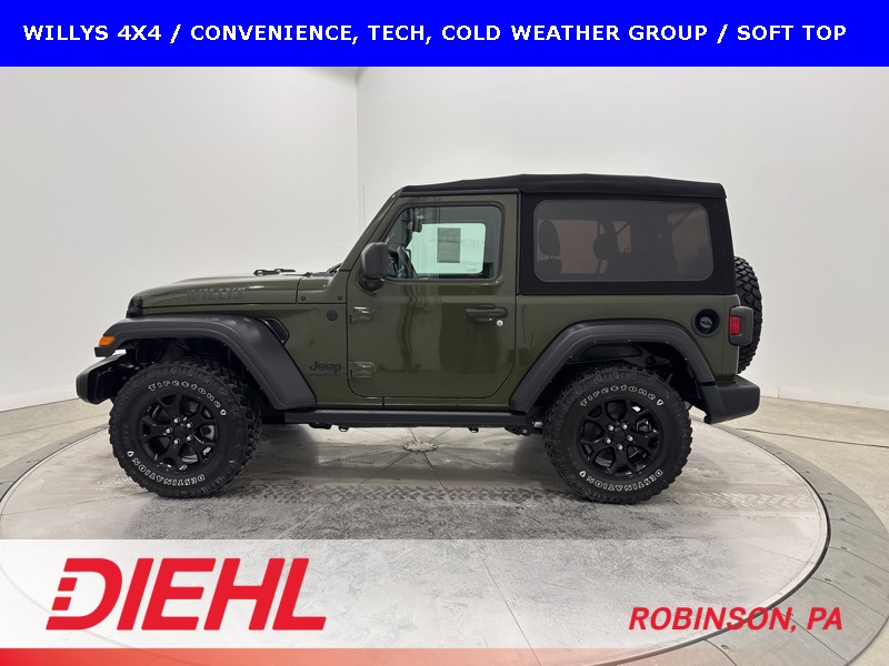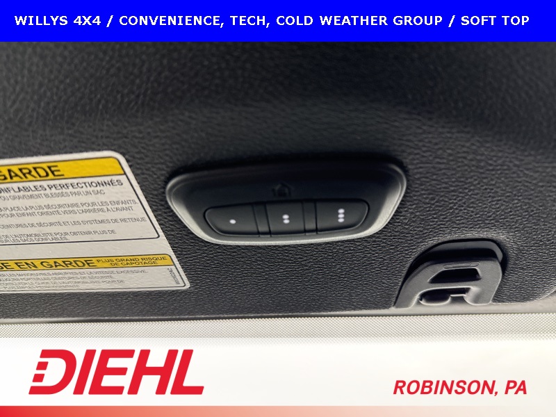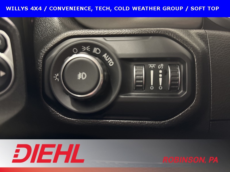 The Willys package adds serious off-road character with 17-inch black aluminum wheels, LT255/75R17 all-terrain tires, rock protection side rails, heavy-duty suspension with off-road tuning, and distinctive Willys exterior accents that pay homage to Jeep’s roots. Practical features like LED headlamps and fog lamps, deep-tint sunscreen windows, and the premium black Sunrider soft top make this Wrangler just as enjoyable day-to-day as it is on the trail.
