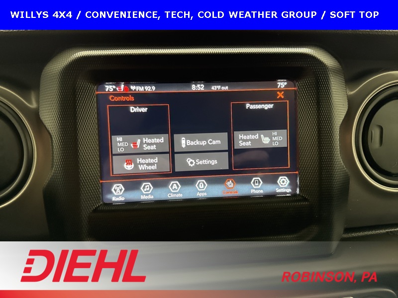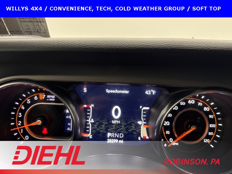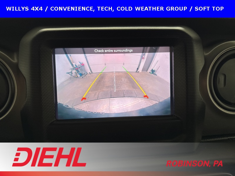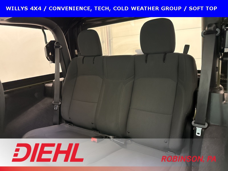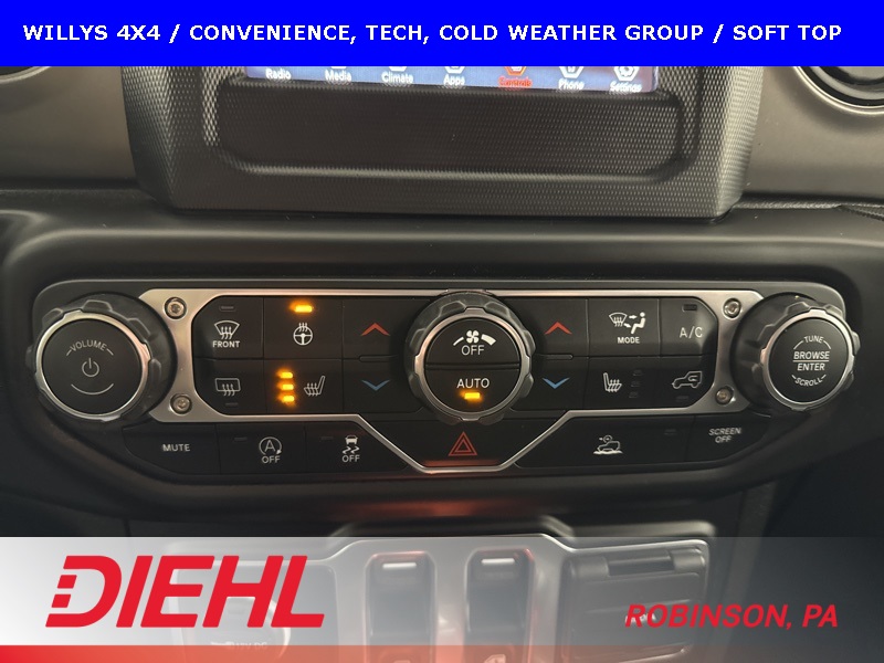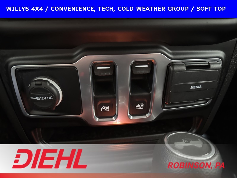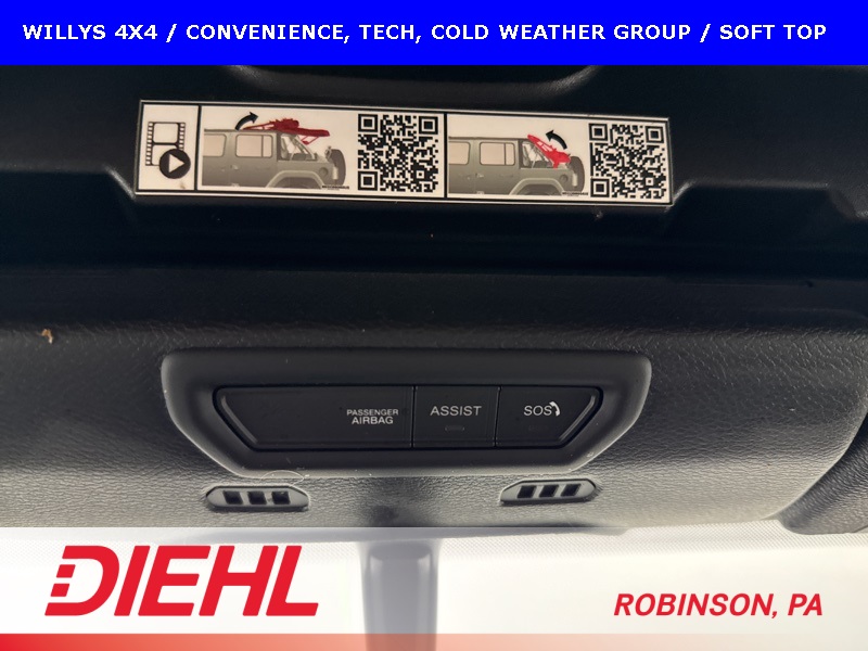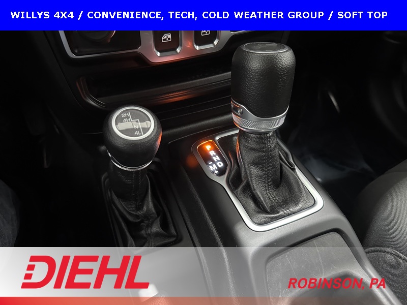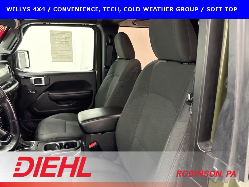 The Willys package adds serious off-road character with 17-inch black aluminum wheels, LT255/75R17 all-terrain tires, rock protection side rails, heavy-duty suspension with off-road tuning, and distinctive Willys exterior accents that pay homage to Jeep’s roots. Practical features like LED headlamps and fog lamps, deep-tint sunscreen windows, and the premium black Sunrider soft top make this Wrangler just as enjoyable day-to-day as it is on the trail.