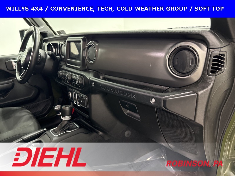 This 2022 Jeep Wrangler Willys 4x4 is the perfect blend of classic Jeep attitude and modern capability, finished in Sarge Green Clear-Coat with a rugged Black interior that fits the Willys personality perfectly. Power comes from the proven 3.6L V6 engine with ESS, paired to an 8-speed automatic transmission and a true Command-Trac part-time 4WD system, giving this Wrangler confident performance on the road and genuine capability when the pavement ends.