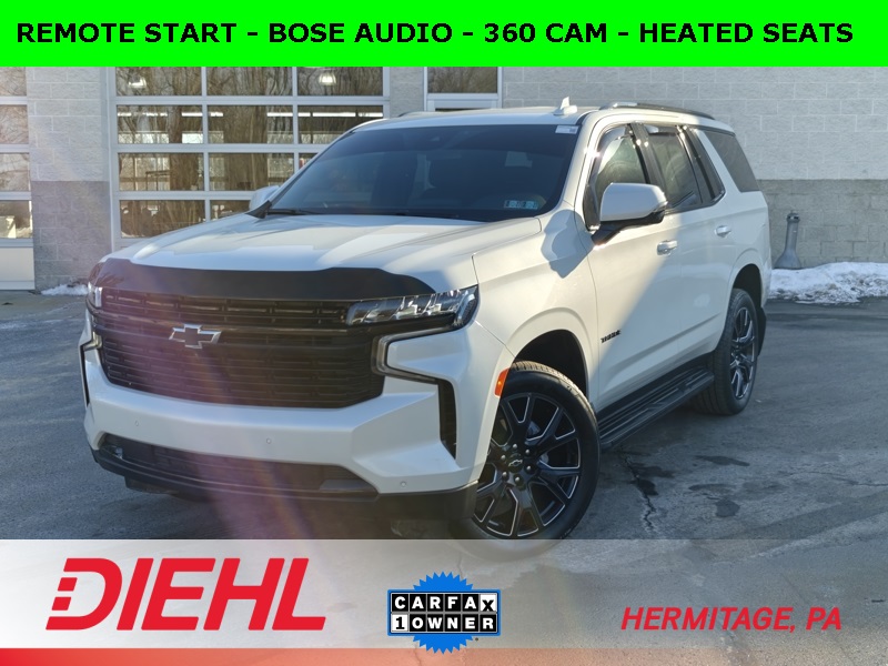 **ONE OWNER**, **CLEAN CARFAX**, **FOUR WHEEL DRIVE**, **HEATED SEATS**, **ADAPTIVE CRUISE CONTRL**, **LANE KEEP ASSIST**, **BLIND SPOT DETECTION**, **FRONT CRASH DETECTION**, **BLUETOOTH**, **BACKUP CAMERA**, **PREMIUM WHEELS**, **3RD ROW SEATING**, ** REMOTE START**, **TOW PACKAGE**, **ANDROID AUTO**, **APPLE CARPLAY*, **1st & 2nd Row Color-Keyed Carpeted Floor Mats Auto-Dimming Inside Rear-View Mirror Bose 9-Speaker Stereo Audio System Feature Bright Front & Rear Door Sill Plates Color-Keyed Carpeting Floor Covering Driver & Front Outboard Passenger Airbags Enhanced Driver Information Center Floor Console w/Storage Area Hands-Free Rear Power Programmable Liftgate LED Daytime Running Lamps Memory Settings for Driver Remote Start SiriusXM w/360L Universal Home Remote Wireless Charging Wrapped Steering Wheel**, Tahoe RST, 4WD, Iridescent Pearl Tricoat, Jet Black/Victory Red Leather, 1st & 2nd Row Color-Keyed Carpeted Floor Mats, 2nd Row Pwr Release 60/40 Split-Folding Bench Seat, 3rd Row 60/40 Power-Folding Split-Bench Seat, Adaptive Cruise Control, Auto-Dimming Inside Rear-View Mirror, Bose 9-Speaker Stereo Audio System Feature, Bright Front & Rear Door Sill Plates, Color-Keyed Carpeting Floor Covering, Driver & Front Outboard Passenger Airbags, Driver Alert Package, Enhanced Automatic Emergency Braking, Enhanced Driver Information Center, Floor Console w/Storage Area, Hands-Free Rear Power Programmable Liftgate, HD Surround Vision, Heated 2nd Row Outboard Seats, Heated Steering Wheel, Lane Change Alert w/Side Blind Zone Alert, LED Daytime Running Lamps, Luxury Package, Memory Settings, Memory Settings for Driver, Navigation System, Outside Heated Power-Adjustable Mirrors, Power Tilt & Telescopic Steering Column, Preferred Equipment Group 1SP, Rear Cross Traffic Alert, Rear Pedestrian Alert, Remote Start, SiriusXM w/360L, Universal Home Remote, Wireless Charging, Wrapped Steering Wheel.